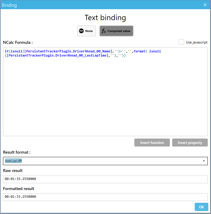 if(isnull([PersistantTrackerPlugin.DriverAhead_00_Name],'')='','',format( isnull([PersistantTrackerPlugin.DriverAhead_00_LastLapTime],''),''))